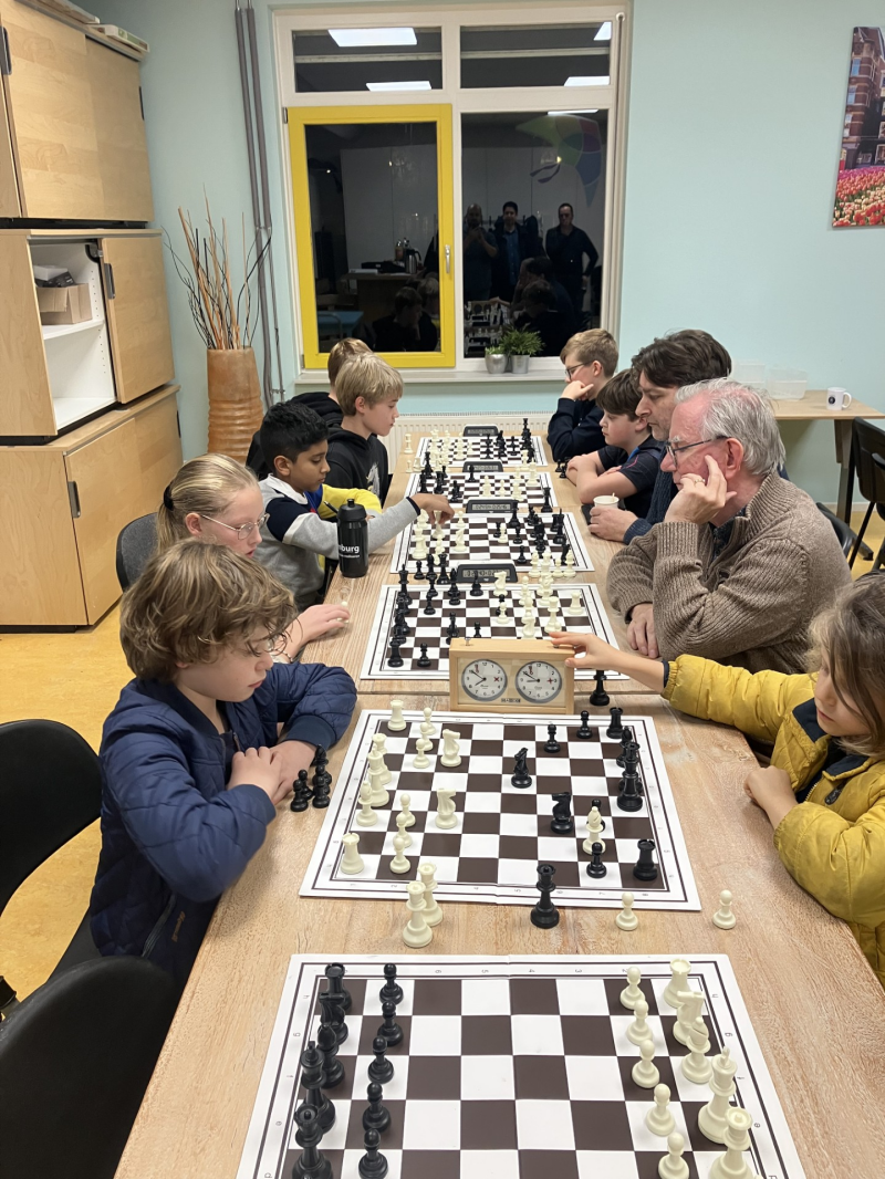 Het plan was om met 10 tegen 10 te spelen, maar uiteindelijk werd het zelfs 11 tegen 11. Onze vier jeugdleiders namen plaats op de eerste vier borden, en de overige borden werden bezet door onze A-groepers. Op verzoek van Krimpen werd er rapid gespeeld, zodat iedereen op tijd naar huis kon — donderdag is immers gewoon een schooldag.