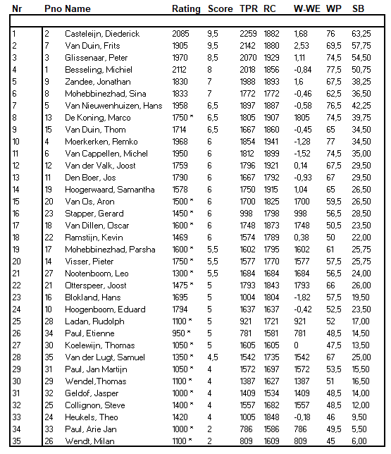 Iets na 20:00 startten we het gebeuren. Snelschaken is toch een andere tak van sport dan klassiek schaak. De eerste ronden is het altijd een beetje in komen, zeker voor de schakers die niet vaak snelschaken. Aan de kop bleef het spannend tot aan de laatste ronde. Frits van Duin, Peter Glissenaar, Hans van Nieuwenhuizen en Diederick Casteleijn bleven elkaar op de hielen zitten door elkaar punten afhandig te maken. Uiteindelijk waren het Frits van Duin en Diederick Casteleijn die beide de laatste ronde wonnen en daardoor gezamenlijk aan kop eindigden met 9,5 punten.